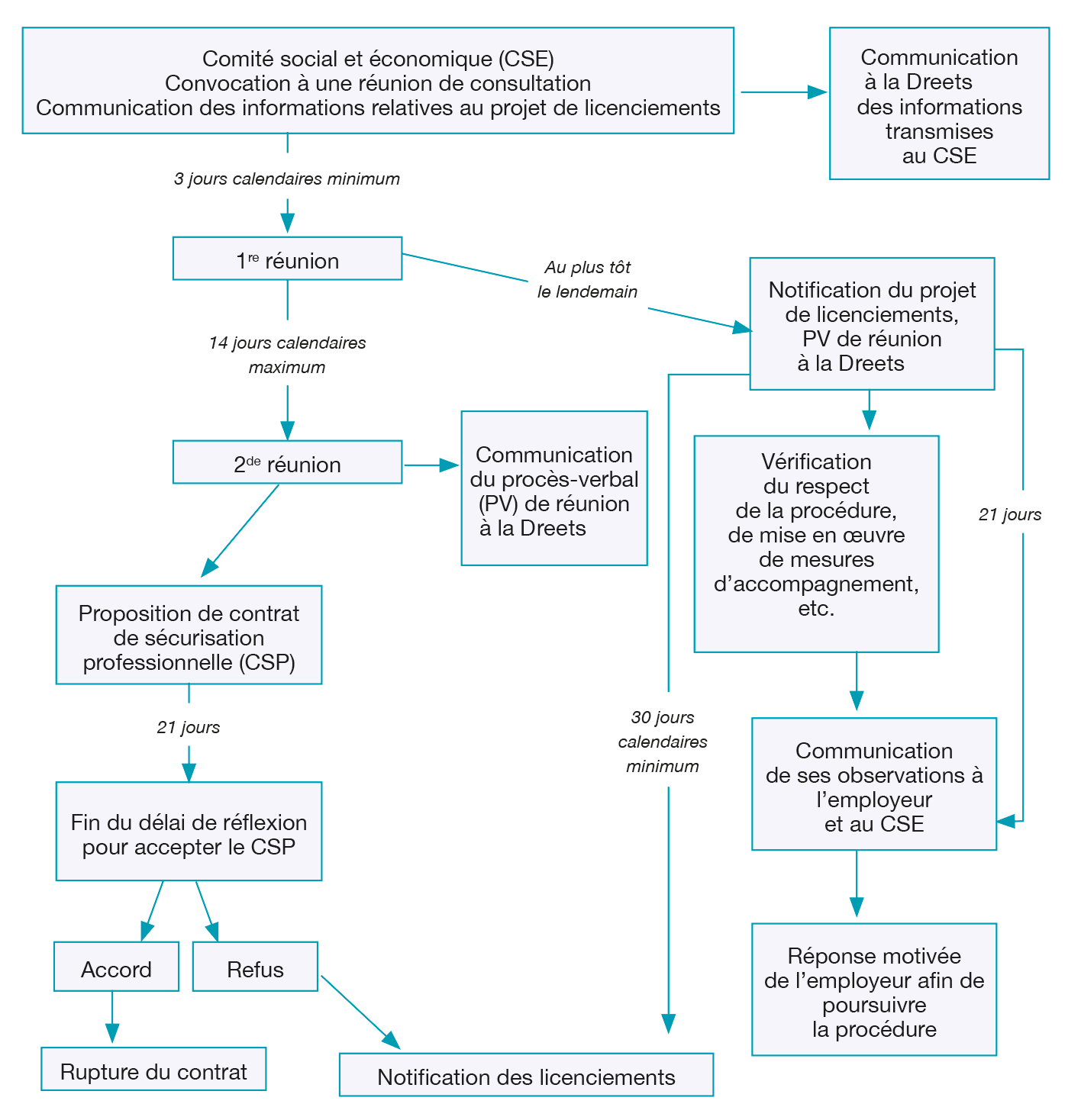 - Il fait suite à des difficultés économiques (ex. : baisse significative des commandes ou du chiffre d'affaires pendant 1 à 4 trimestres consécutifs selon l'effectif de l'entreprise), à des mutations technologiques, à une réorganisation de l'entreprise nécessaire à la sauvegarde de sa compétitivité, ou encore à une cessation définitive et totale de l’activité de l’entreprise. Les difficultés économiques pouvant justifier un licenciement économique sont caractérisées soit par l'évolution significative d'au moins un indicateur économique telle qu'une baisse des commandes ou du chiffre d'affaires, des pertes d'exploitation ou une dégradation de la trésorerie ou de l'excédent brut d'exploitation, soit par tout autre élément de nature à justifier de ces difficultés. Une baisse significative des commandes ou du chiffre d'affaires est constituée dès lors que la durée de cette baisse est, en comparaison avec la même période de l'année précédente, au moins égale à : un trimestre (entreprise de moins de 11 salariés) ; 2 trimestres consécutifs (entreprise de 11 à moins de 50 salariés) ; 3 trimestres consécutifs (entreprise de 50 à moins de 300 salariés) ou 4 trimestres consécutifs (entreprise d'au moins 300 salariés).